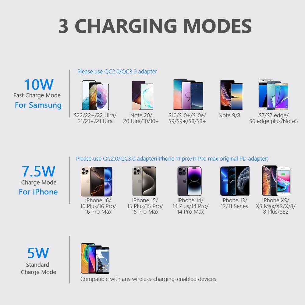Featuring a 10W max charging capacity, this wireless charger is compatible with a wide range of devices including iPhone 16/16 Plus/16 Pro Max/15/14/13/SE 2022/12/11/X/8 and Galaxy S22/S21/S20/S10. Simply place your device on the stand and watch as it charges quickly and efficiently.